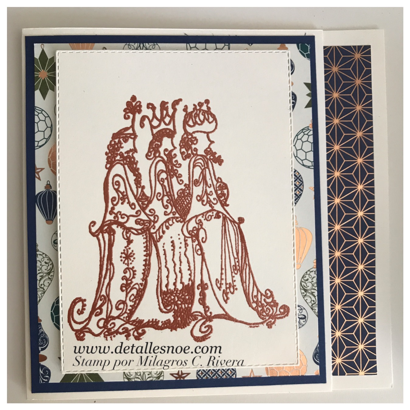 Mat Night of Navy 4 3/4″ x 5 3/4″, papel de diseño Brightly Gleaming Specialty Designer Series Paper (DSP), Rectángulo crema donde corté los Reyes Magos de @Milagros C. Rivera de Paper Boutique en Fajardo, 3 3/4″ x 5 1/8″ recortado con los Stitched Rectangles Dies, DSP de adentro 5 1/2″ x 5 1/2″ y el mensaje “VENID ADOREMOS….” con sello de @Latina Crafter, por la puertorriqueña Diana Maldonado, fué estampado en vainilla 3 5/8″ x 2 1/2″ y cortado con los Stitched so Sweetly Dies. Para estampar los Reyes Magos hice uso de la tinta Versamark, Wow color Cobre Embossing Powder (de la tienda de Milagros C. Rivera) y el Heat Gun.